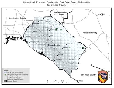 The beetle's spread has been rapid and human-aided, primarily via the movement of infested firewood. From its foothold in San Diego, GSOB has expanded to Riverside, Orange, Los Angeles, San Bernardino, and most recently, Ventura County in 2025. CAL FIRE estimates that GSOB has killed at least 200,000 oaks across the Southland, transforming vibrant woodlands into "boneyards" of dead trees. In areas like Simi Valley, entire hillsides of oaks have succumbed, leaving behind skeletal remnants that heighten fire risks.
