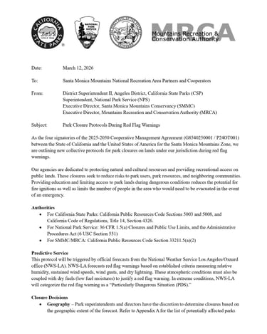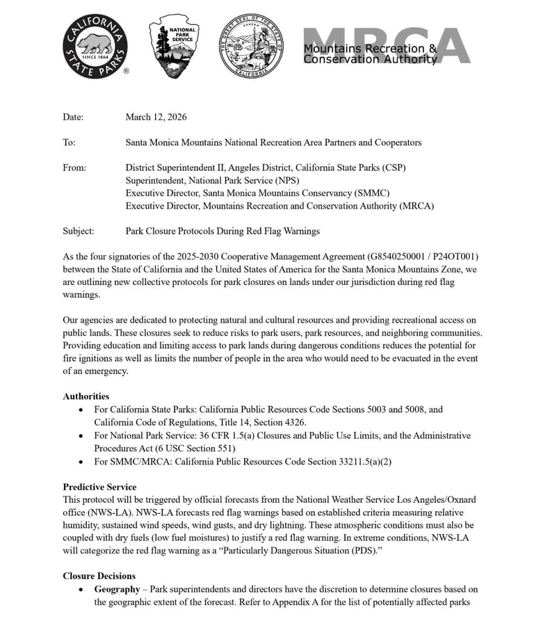 The memorandum, dated March 12, 2026, and signed by top officials from California State Parks (CSP), the National Park Service (NPS), the Santa Monica Mountains Conservancy (SMMC), and the Mountains Recreation and Conservation Authority (MRCA), standardizes how closures will be handled across more than 150,000 acres of public lands in the Santa Monica Mountains Zone.
