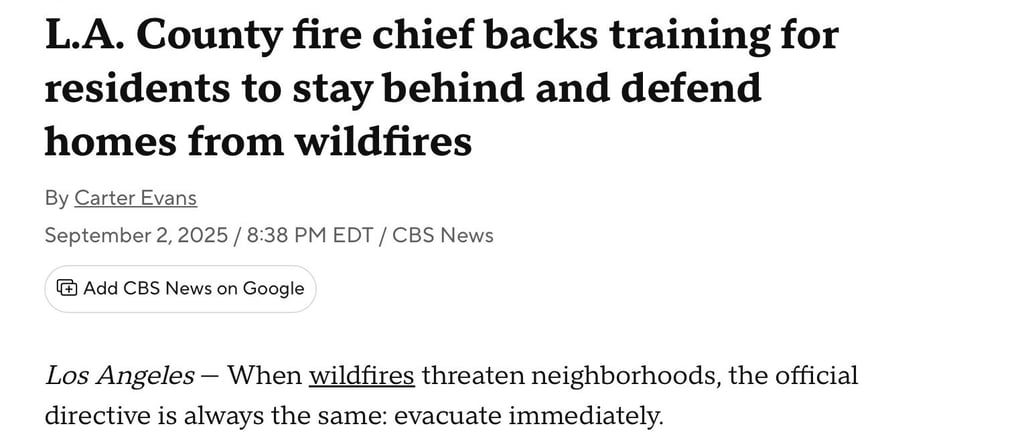 At Fast Fire Network, we're always tracking developments that empower homeowners and communities to better protect their properties in the face of escalating wildfire threats. A recent CBS News report (September 2, 2025) highlights a significant shift in Los Angeles County: Fire Chief Anthony Marrone is openly supporting training programs that allow properly prepared residents to stay behind and defend their homes during wildfires, rather than evacuating every time.